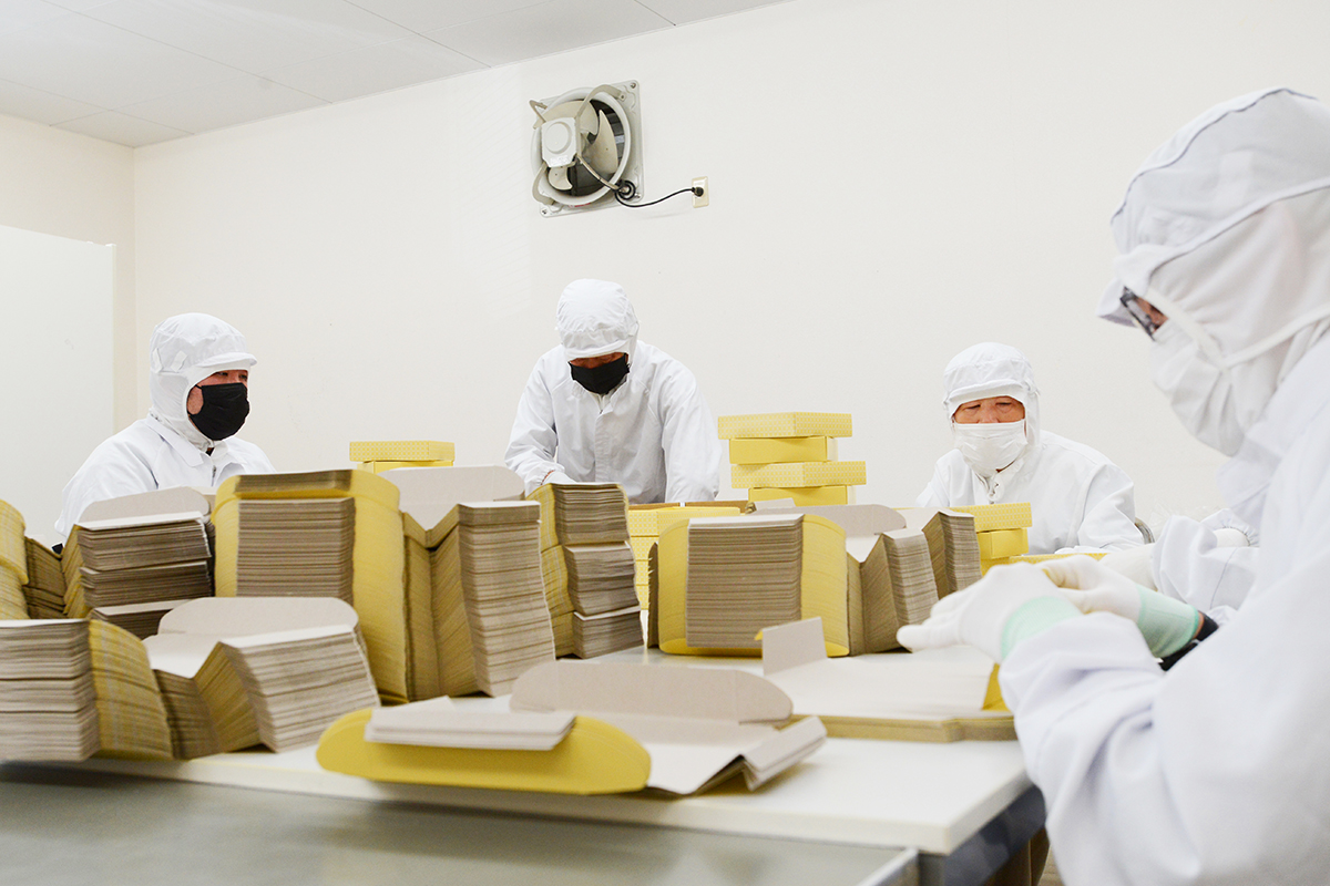 食品に関係する箱折りなどの作業では、衛生面への配慮を徹底した上でクリーンルームの設置を行うなど、請け負った作業内容に合わせた環境を準備しています。検品作業では厳しい検査基準を設けた上で、職業指導員の目を通して取り組んでいます。