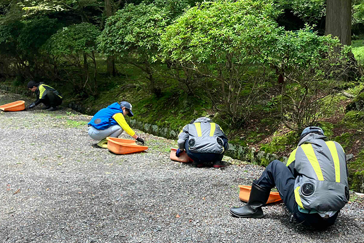日吉大社の門前町である坂本周辺のグラウンドや体育館などの清掃・除草業務、三井寺境内の環境整備などを行っています。夏場は熱中症対策としてファン付き作業服の着用や適度な休憩時間を設け、作業時の負担にも配慮しています。