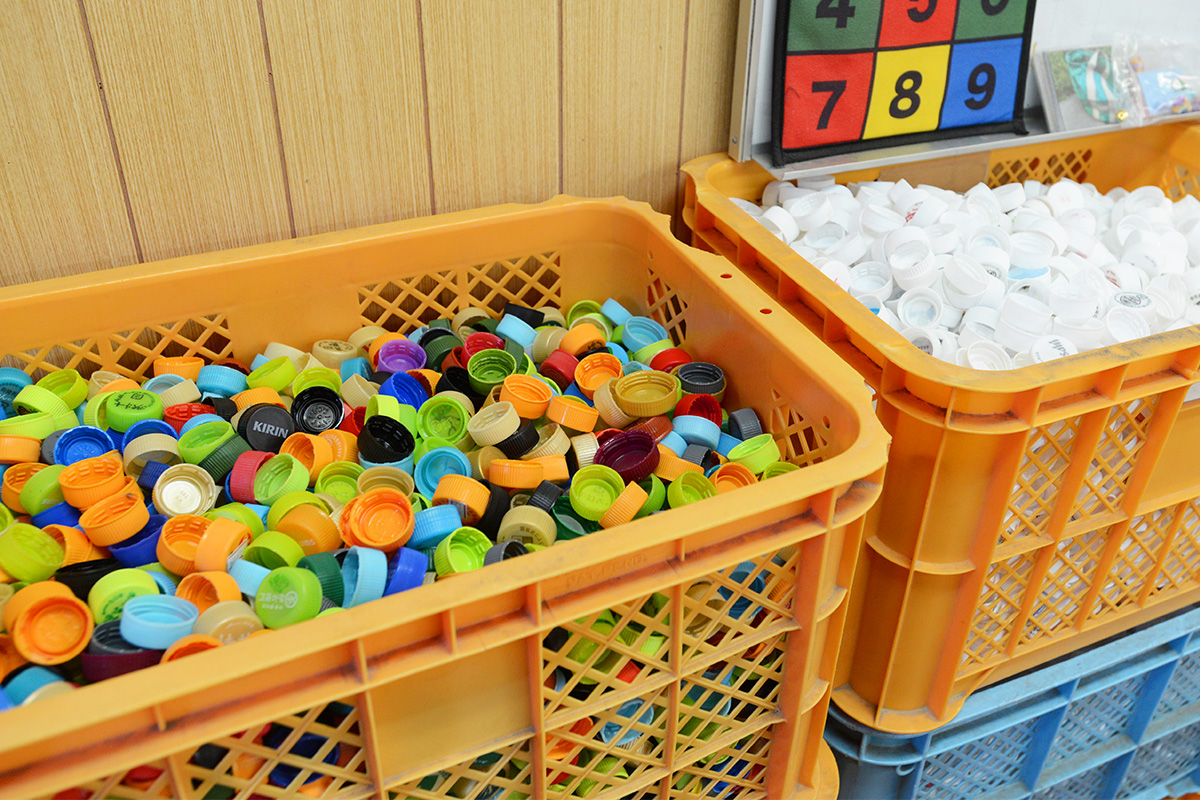 ペットボトルキャップの分別やアルミ缶回収など、再生資源利用・促進にも取り組んでいます。